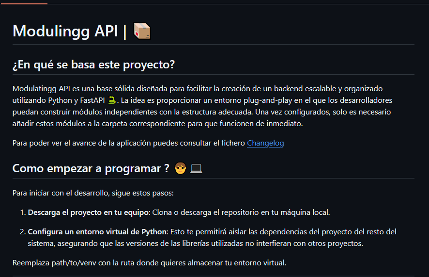 Uno de mis proyectos más relevantes es Modulingg, una aplicación basada en FastAPI que permite agregar módulos con endpoints que se integran automáticamente, facilitando la expansión de aplicaciones de manera sencilla y eficiente. Este proyecto refleja mi interés por crear soluciones escalables y bien estructuradas.